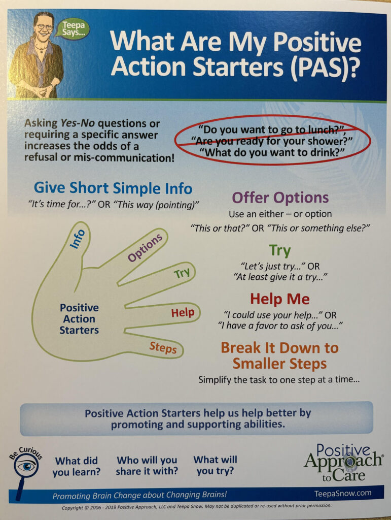 Breaking down care tasks into clear steps helps the resident feel more comfortable and confident. If we see a resident become frustrated or afraid, stop and ask how you can better understand what they are seeing and hearing. Then break down the tasks and communicate them one step at a time. Remember: A resident needs to see you first, then hear you before placing hands on them to avoid a startle effect.