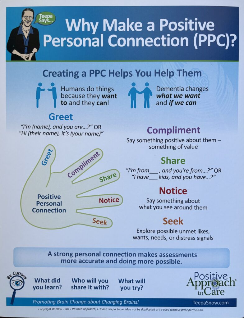2. Positive Approach to Care: Connect to the resident first then partner with the resident to meet care needs. What are 5 ways to connect? SEE BELOW