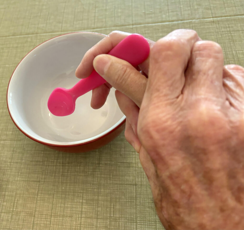 - Adaptations to cups, plates and utensils: We can provide adapted utensils for easier use during meals. These include larger grips that attach to forks and spoons, bendable utensils, or weighted utensils (to ease tremors). Cups with handles, straws or tops that seal with a spout for better fluid intake with less spills. And plates with high sided partitions to make it easier to scoop. Many of these adaptations are designed to help the resident retain independence with their meals.